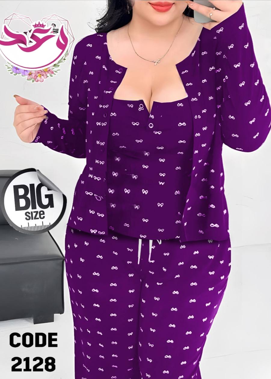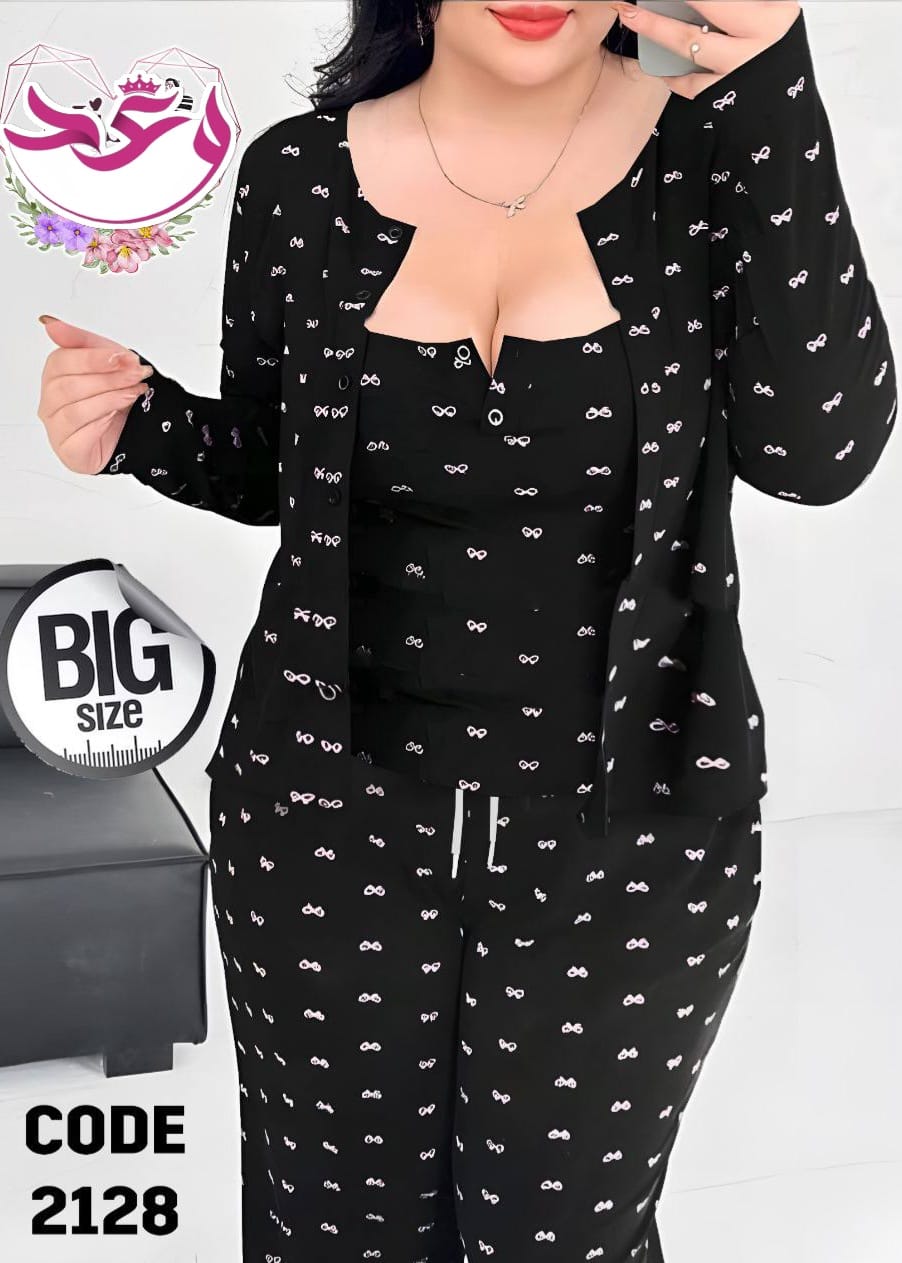 بيجاما حريمي تلت قطع جاكت وتوب حماله وبنطلون طباعه سبلميشن